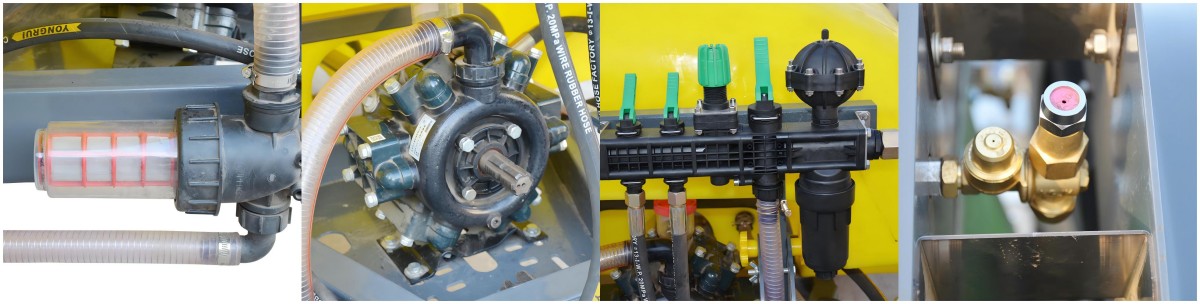 পাম্প তরলকে চাপ দেয়, যা পায়ের পাতার মোজাবিশেষের মধ্য দিয়ে স্প্রে অগ্রভাগে প্রবাহিত হয়। এই অগ্রভাগগুলি তরলকে সূক্ষ্ম ফোঁটায় পরমাণু করে, ট্রেইলড স্প্রেিং মেশিন এক পাসে সমানভাবে ফসল/বাগানগুলিকে ঢেকে দেয়।